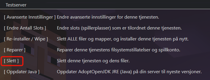 Obs: Dette vil også slette evt. databaser du har opprettet i tilknytning til denne spillserveren.
