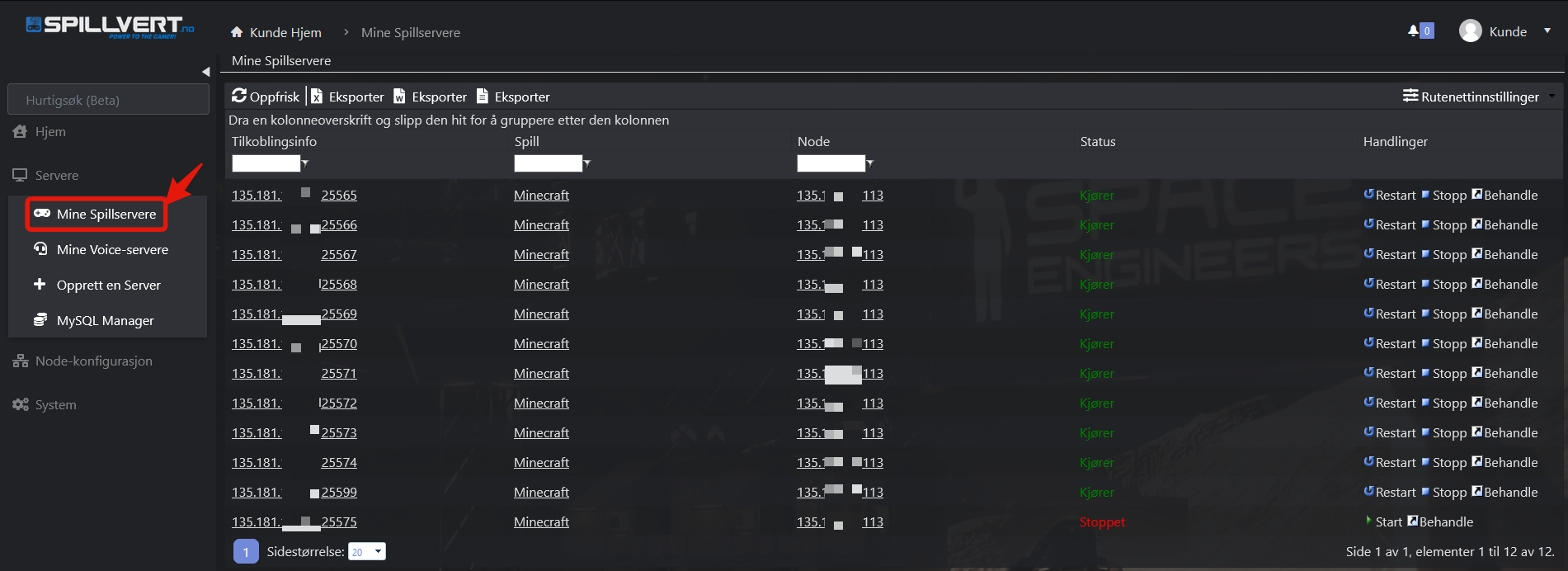 2) Klikk på menyen Mine Spillservere og klikk deretter på serveren som skal slettes