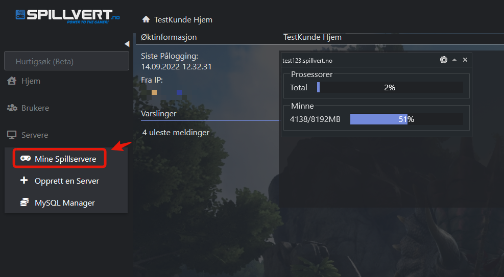 1) Logg inn på vårt Game Panel med brukernavnet og passordet som du fikk i din velkomstmail
