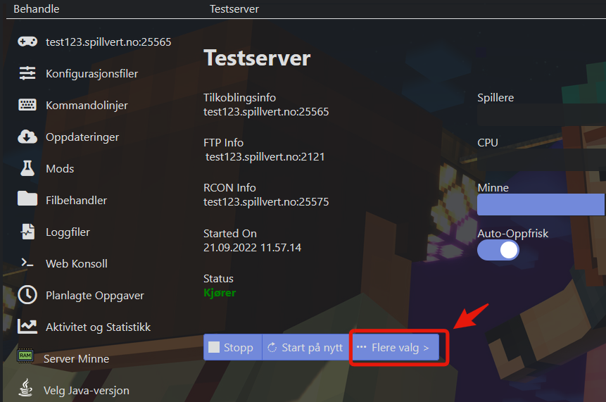 3) Inne på spillserveren klikker du på knappen Flere Valg >