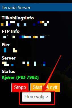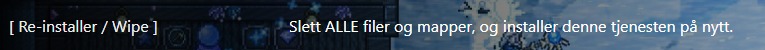 For å re-installere/wipe din server helt, kan du klikke på knappen "Flere valg >" i game panelet ditt og så klikke [Re-installer / Wipe]