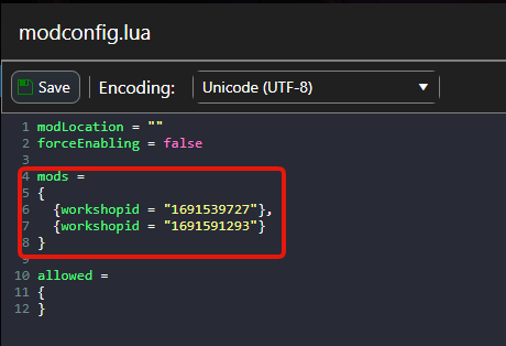 Du er nå ferdig. Klikk Lagre og start serveren din. Serveren vil nå automatisk laste ned modden fra Steam. Alle som kobler til serveren vil få tilbud om å automatisk installere modden som serveren kjører før de kobler til.