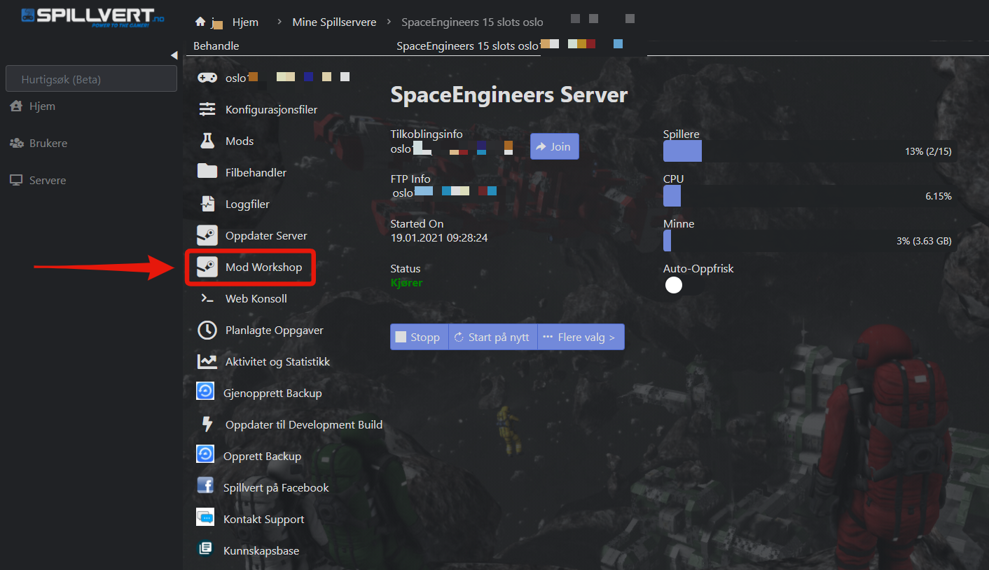 Mods for din Space Engineers server kan du enkelt installere, oppdatere og avinstallere i game panelet ditt. Dette gjør du ved å klikke på knappen "Mod Workshop" som vist på bildet under: