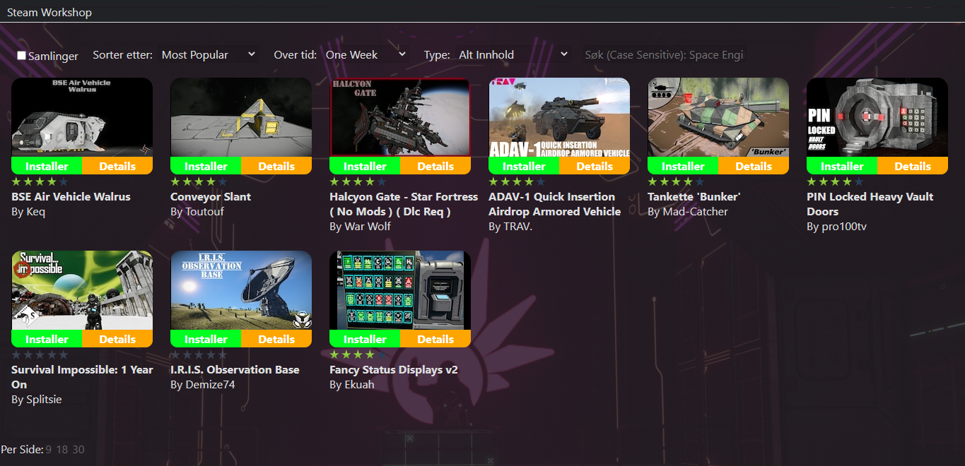 I Mod Workshop får du full oversikt over alle mods som er tilgjengelig for Space Engineers via Workshop. I denne oversikten kan du også se hvilke mods du har installert, og hvilke av dine installerte mods som krever oppdateringer.