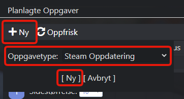 2) Klikk +Ny, velg Oppgavetype: Steam Oppdatering og klikk så [ Ny ]